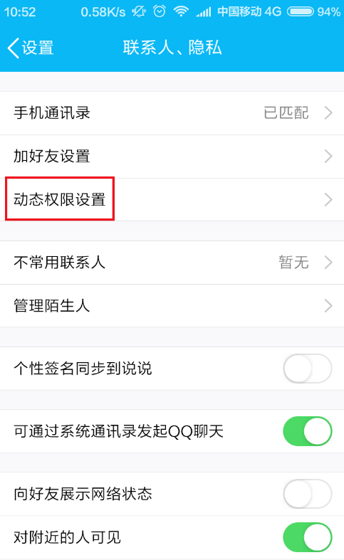 2、进入手机QQ设置页面中,点击选择“联系人、隐私”设置选项,打开相关的设置项目。