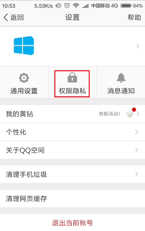 3、在QQ空间设置页面中,点击页面中的“权限隐私”选项,进入QQ空间隐私设置页面。
