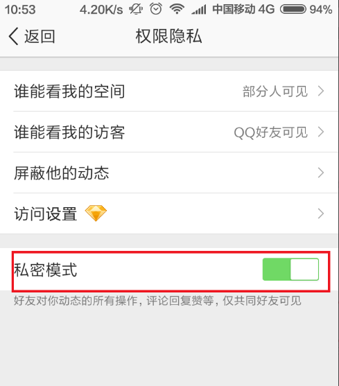 4、在隐私设置页面中,我们可以看到最后一个设置项目,点击对应的按钮开关即可开启QQ空间的私密模式。