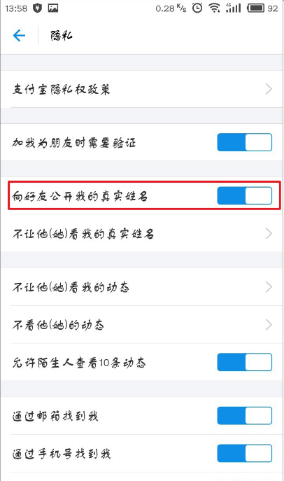 3、点进去后,点击“向好友公开我的真实姓名”,将旁边的蓝色按钮关掉,这时就向支付宝所有好友隐藏了自己的真实姓名。