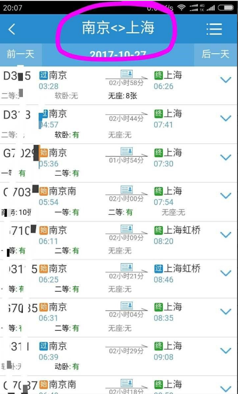 2、比如说我这里选择南京到上海的车,先看动车高铁系列的,选择一个合适的时间车次,