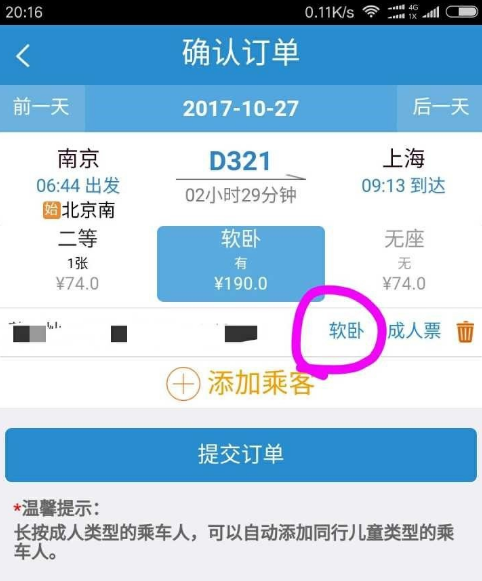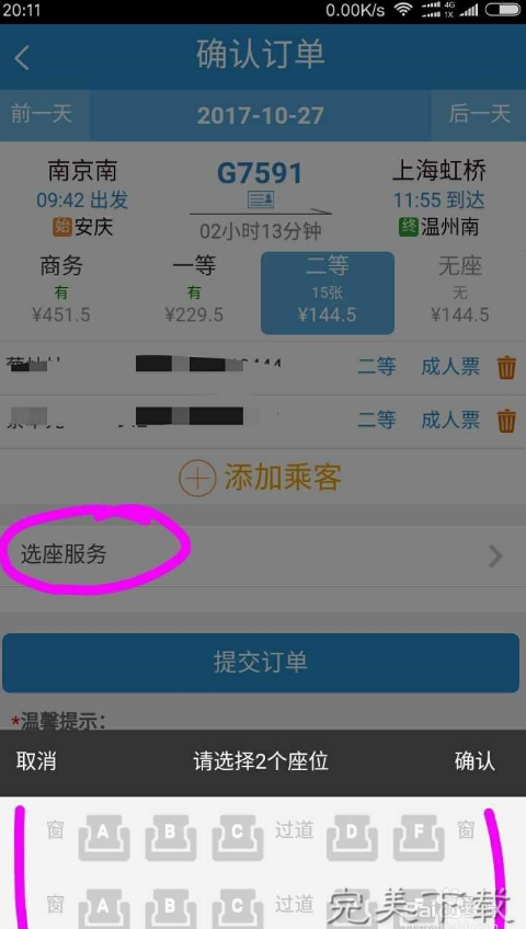 4、如果不止一个乘客,就会出来两排座位供你选择,如果不在一排的话有可能到时候买到的票座位会离得很远。但是如果坐在一起的话,票数紧张的情况可能买不到票噢。