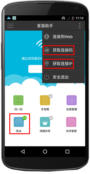 打开爱莫助手上的“热点”功能,然后将Mac连接到这个热点,在浏览器上输入指定的IP地址建立连接。