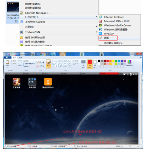 先用模拟器的截图功能把模拟器的图截下来,然后用电脑自带的“画图”软件打开这个截图,鼠标移动到画面中相应的点上,左下方就会显示像素坐标,可以轻松得到模拟器里每个点的位置坐标了。如下图:
