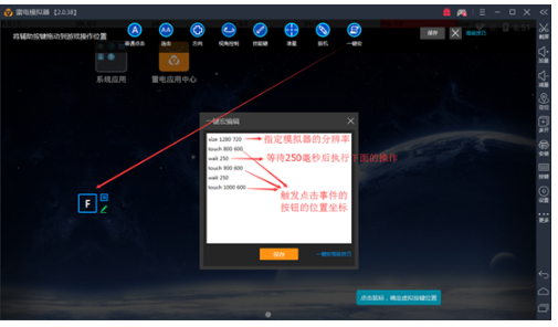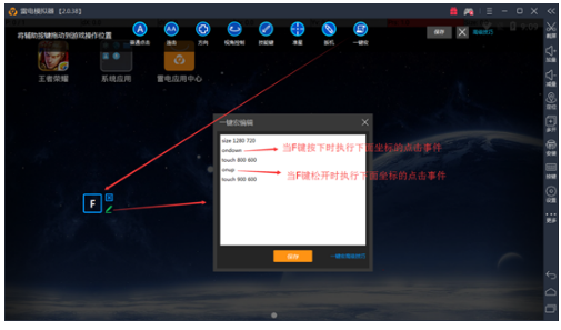 输入指令如下图,这个一键宏的意思是,在分辨率为1280*720的模拟器中,按下F键,系统自动触碰(800 600)(900 600)(1000 600)三个像素坐标的虚拟按键,所用时间为500ms。