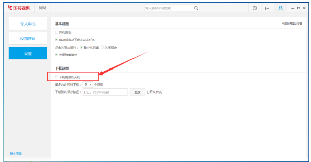 3、之后在“设置”界面的“下载设置”中就可以看到“下载完成后关机”的功能了,我们只需勾选上它即可开启乐视视频的下载完成自动关机功能。