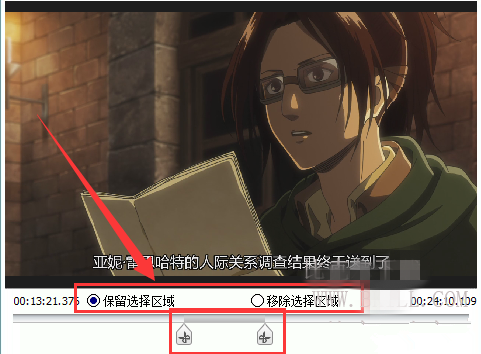 4、如果你只想合并视频中的某一部分,还可以选中该视频后在右边的预览窗口中进行剪辑(拖动进度条上的两个按钮来选择截取区域);