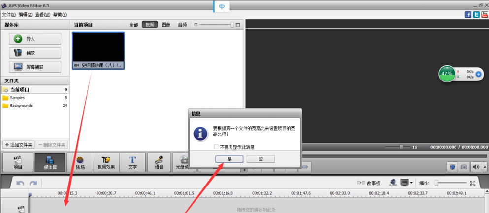 3、将视频拖到视频轨,同意按照视频宽高比设置项目宽高比,