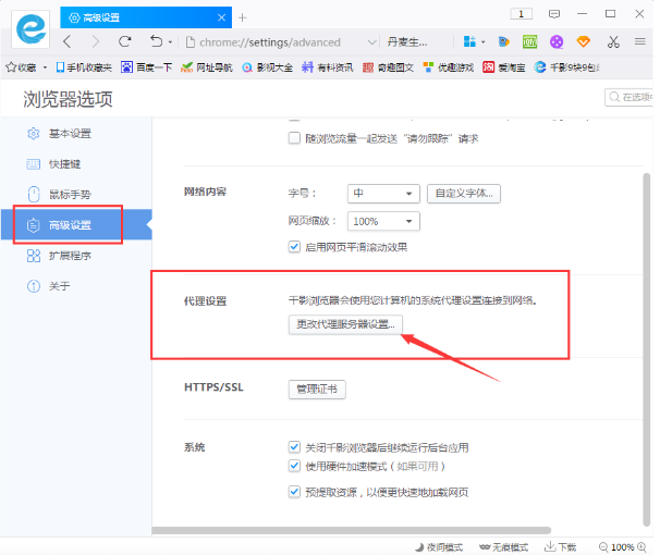 3、接着在设置界面的左侧打开“高级设置”,之后在右边的“代理设置”中打开“更改代理服务器设置”;