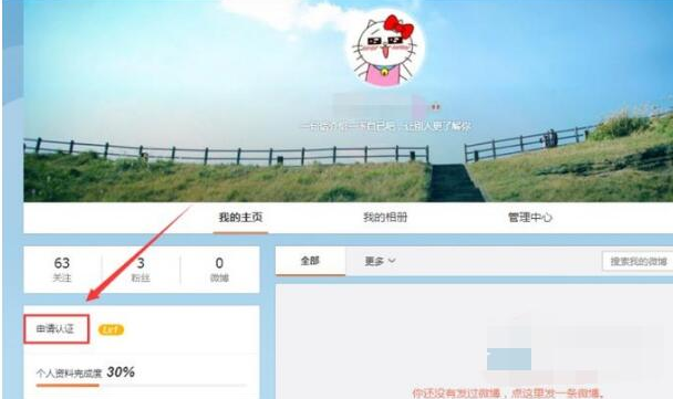1、进入你的主页,在主页的左边粉丝栏下面可以找到【申请认证】按钮,点击。