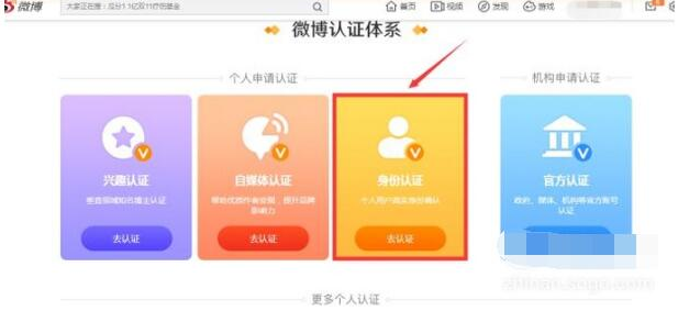 2、个人认证有三种形式:兴趣认证、自媒体认证、身份认证,这里选择“身份认证”,如图,