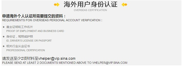 海外用户实名认证需要准备好雇主证明和工作名片、身份证,驾照或者护照,相关行业从业证书。将内容发送早vhelper@vip.sina.com邮箱,即可完成实名认证申请。
