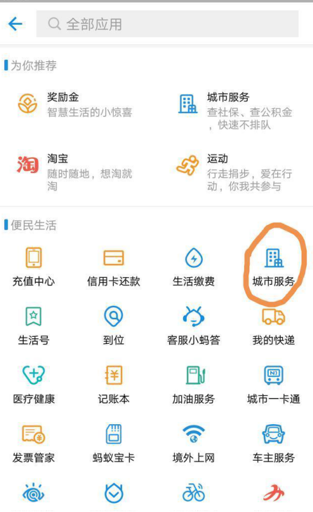 2、进入全部应用,点击“便民生活”中的“城市服务”选项,
