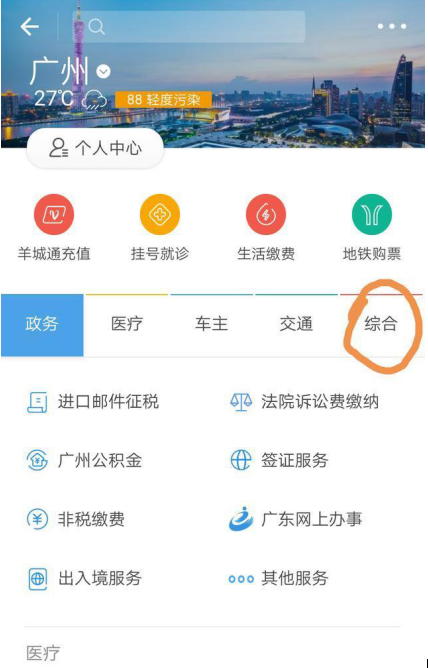 3、进入个人服务中心,找到“综合”选项,