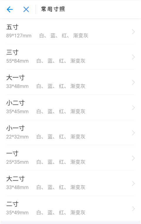 6、假如我们需要一寸的照片,点击这里的一寸,这里可以直接拍摄也可以使用相册中的照片。导入照片之后你可以更换照片的背景,常用的证件照背景色有蓝色,红色和灰色!