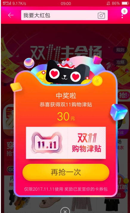4、点击界面中的“立即拆开”,小编抽中的是购物津贴,如果运气好的话,能抽到现金红包。