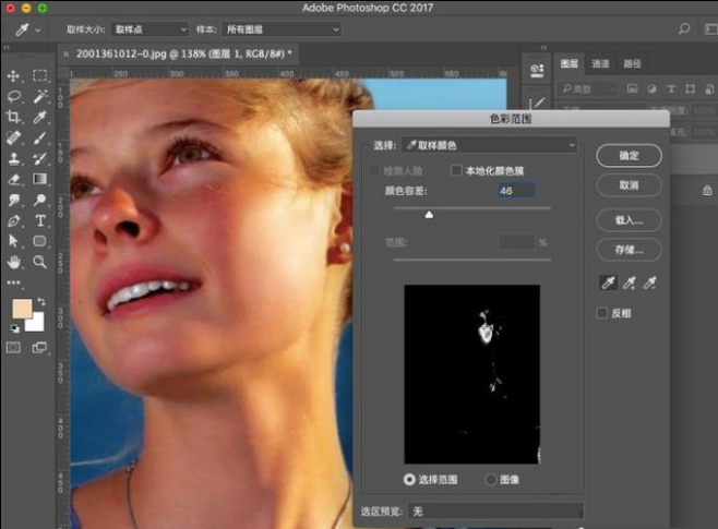 4、进入色彩范围设置界面,对颜色容差进行调整,然后用取色器在需要修复为的皮肤上进行点选。