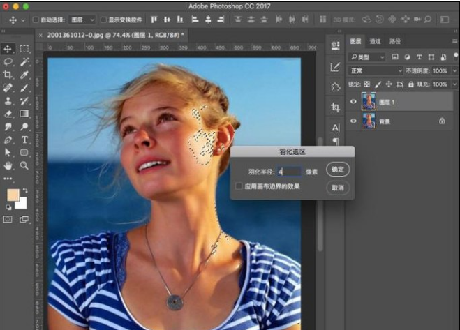 7、在羽化弹框中将羽化半径设置为4px,点击“确定”。