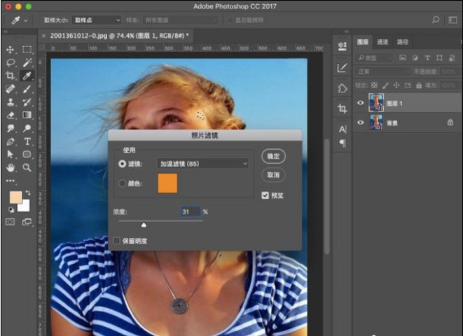 9、在弹框中,选择使用“滤镜”,方式为“加温滤镜”,浓度为31%。