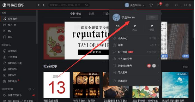 1、登录网易云音乐,进入主界面,我们在最上面找到用户名并点击,