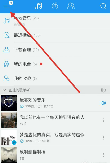 1\\打开网易云音乐APP,进入主界面,点击左上角的小标志(如图所示)。