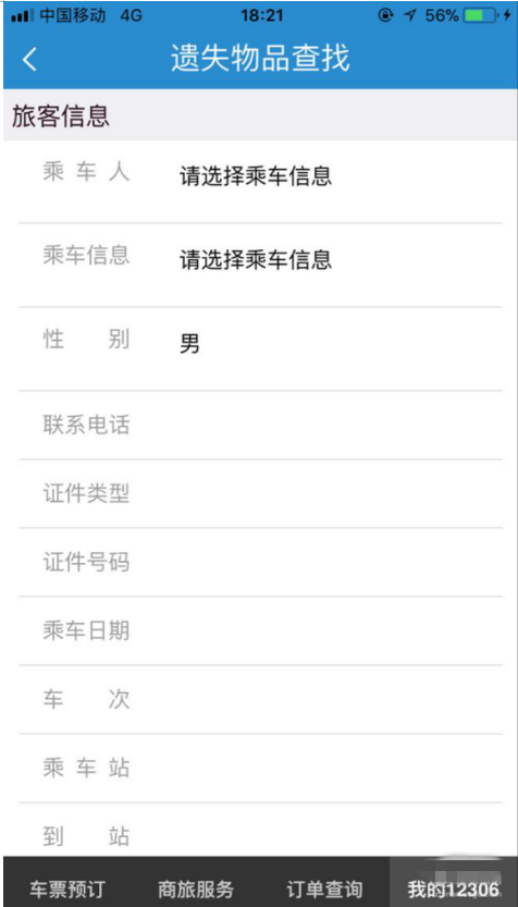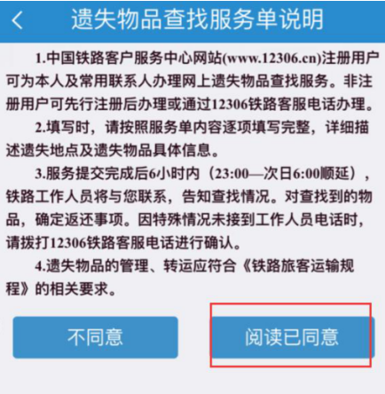 3、浏览遗失物品查找服务单说明,阅读完毕,点击“阅读已同意”,进入遗失物品查找页面,输入乘车人的姓名、联系电话、证件类型、证件号码、乘车日期、车次等基本信息。