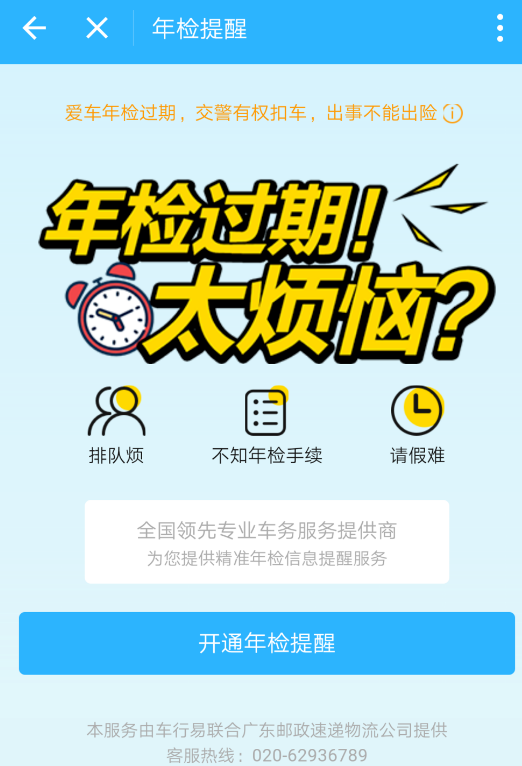 5、在进行授权后弹出第三方提供的服务页面,点击页面中的“开通年检提醒”,