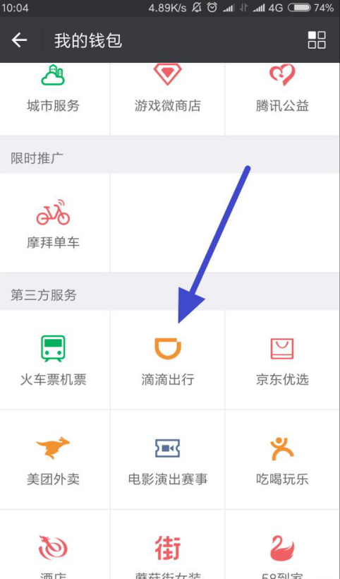 3、在钱包的第三方服务中,找到滴滴出行,点击进入。