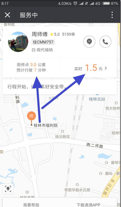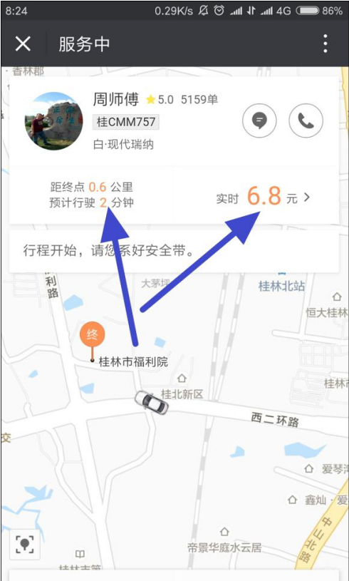 8、稍等待一会儿,司机就会过来接我们。司机接上我们之后,我们可以在页面上面看到距终点的里程,以及预计要行驶的时间,也可以看到时时费用。