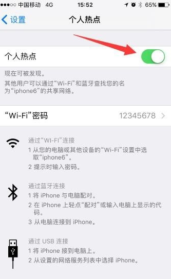 3、进入“个人热点”菜单,向右滑动按钮,即可打开WiFi热点,并设置WiFi密码为12345678。这样苹果手机的WiFi热点就设置好了。