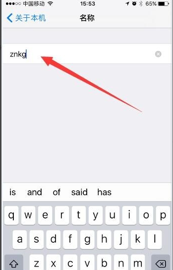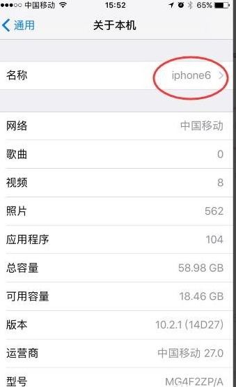 7、进入“名称”界面,将iPhone6修改成znkg,即可设置成功。