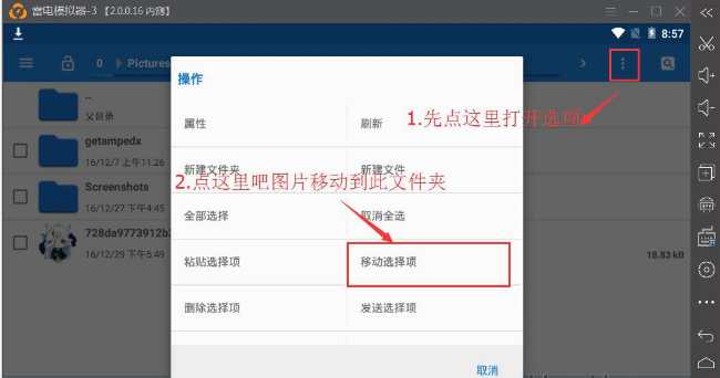 5、然后我们打开选项,点击移动选择项,就可以把图片移动到Pictures文件夹了,如图: