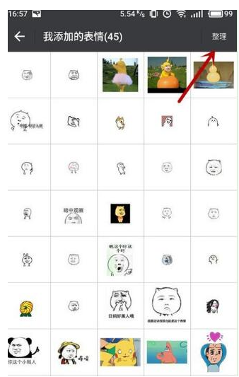 4、进入后即可查看到添加的表情记录,点击右上角“整理”,