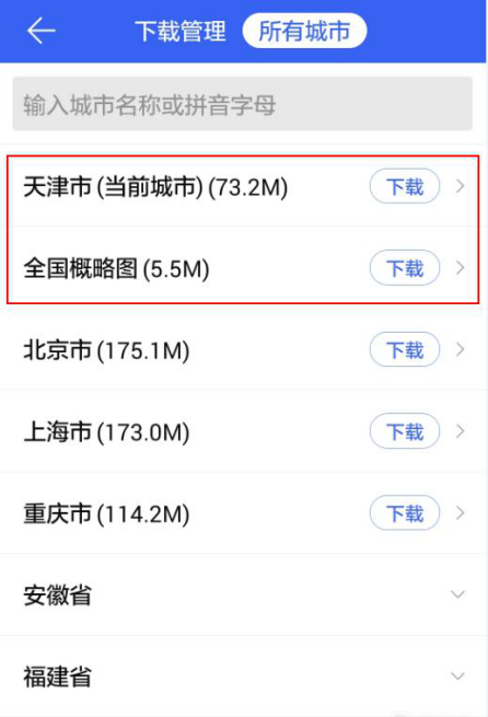 5、下载我们所在城市的地图。注意,全国概略地图为必下载的地图,其他根据自己的情况下载。如果所导航的地区为外地必须把本省市与途径的所有城市的地图全部下载下来。