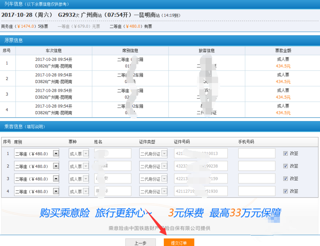 5、确认车票及乘客信息,然后提交订单。