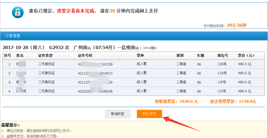 6、提交订单后需在30分钟内支付,同时改签的费用,如果改签后的票价高于原价,则需重新支付,原金额会退还;改签票价低于原价则退还差价。