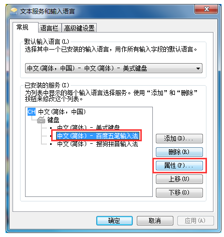 2、在弹出的窗口中选中百度五笔输入法,然后点击“属性”;