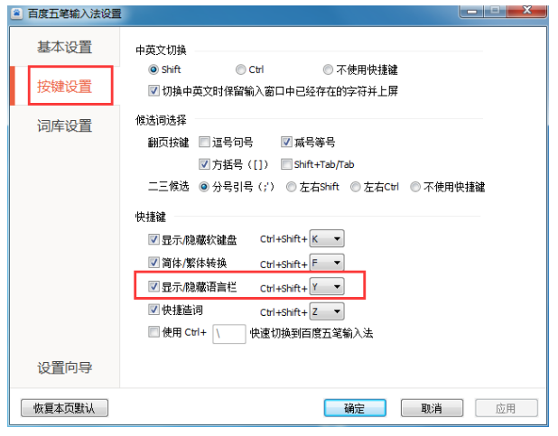 3、接着在弹出的百度五笔输入法设置窗口中打开“按键设置”界面,在这里勾选上“显示/隐藏软键盘”;