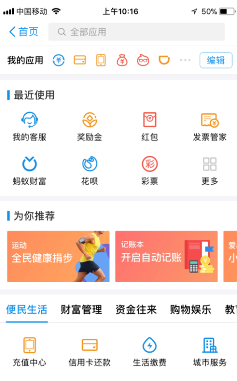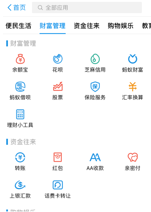 2、然后进入,我们可以看到你最近的一些应用,去下面一栏里找财富管理选项。
