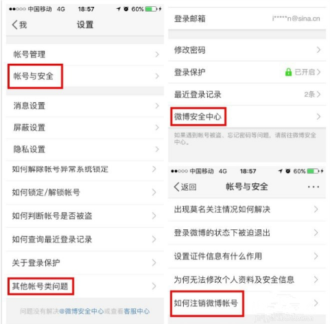 2、进入设置页面后,选择“账号与安全”,然后选择“微博安全中心”,然后再选择“其他账号类问题”,最后再选择“如何注销微博账号”,如下图所示!