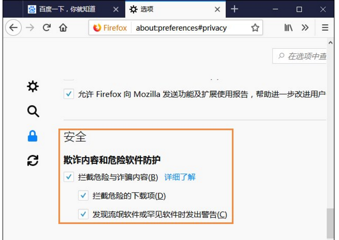 开启火狐浏览器钓鱼保护后,可以保护我们的个人信息安全、网银交易安全等,避免接触钓鱼网站和罕见、可疑文件的下载。