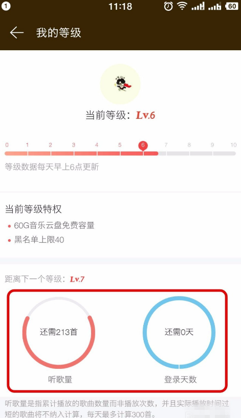 3、进入等级页面后,我们就会看到升等级需要的条件,一个是天数,一个是听歌量。