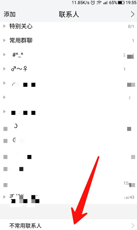 5、隐藏成功之后,退出到好友列表中,查看最下面“不常用联系人”即可查看刚刚被隐藏的好友,点击其,在下方弹出的选项框中即可进行恢复好友等操作!