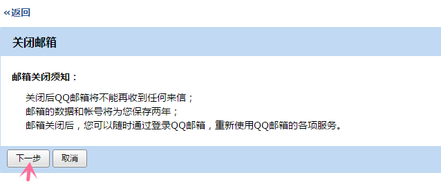 4、这时,页面将显示关闭邮箱须知,点击下一步,