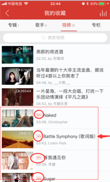 5、前面带有MV的就是收藏的MV视频了。