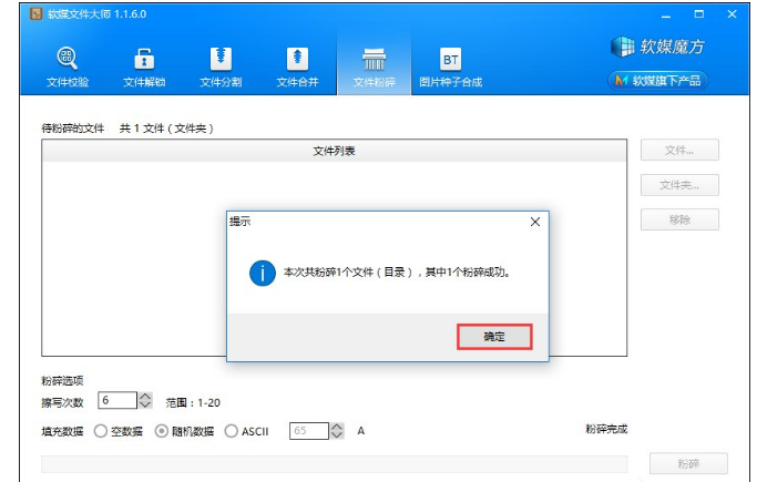 以上内容就是用软媒魔方彻底进行文件粉碎的操作过程介绍,用户在粉碎文件时不要勾选“空数据”填充,要么使用随机数据,要么使用ASCII数据填充5遍以上,才能保证该文件不能被恢复。