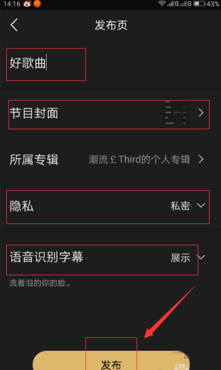 5、设置好标题、节目封面等,我们直接点击“发布”就可以了