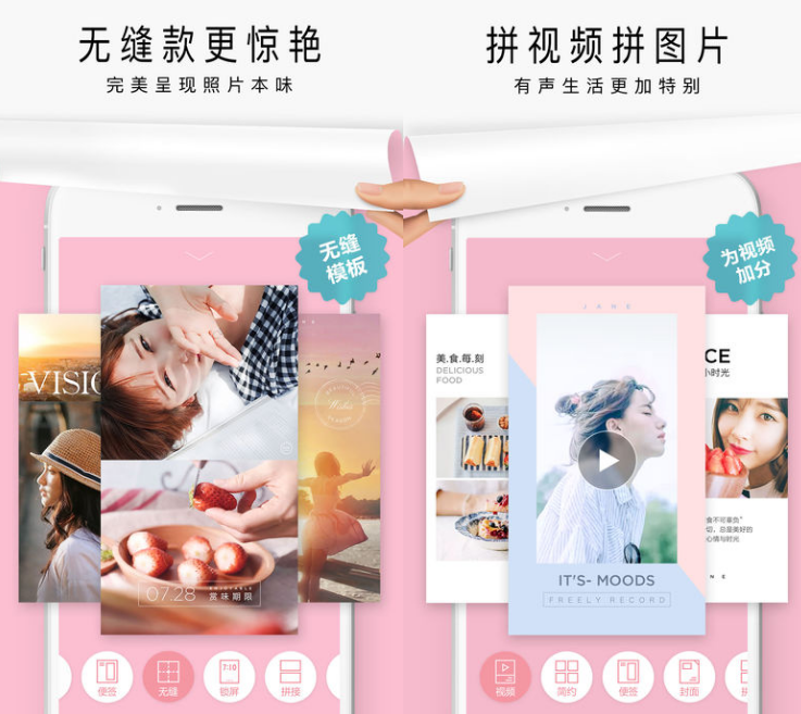 海报拼图:设计师倾力打造数十套海报模板,让普通照片一秒变成万众瞩目的精致大片。