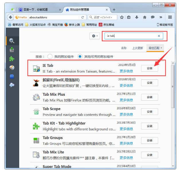 2、接着在附加组件界面的搜索框中输入“ie tab”,并安装此插件,安装完毕后记得重启浏览器;