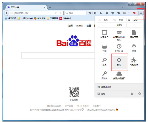 1、我们在火狐浏览器右上角的菜单中打开“选项”;